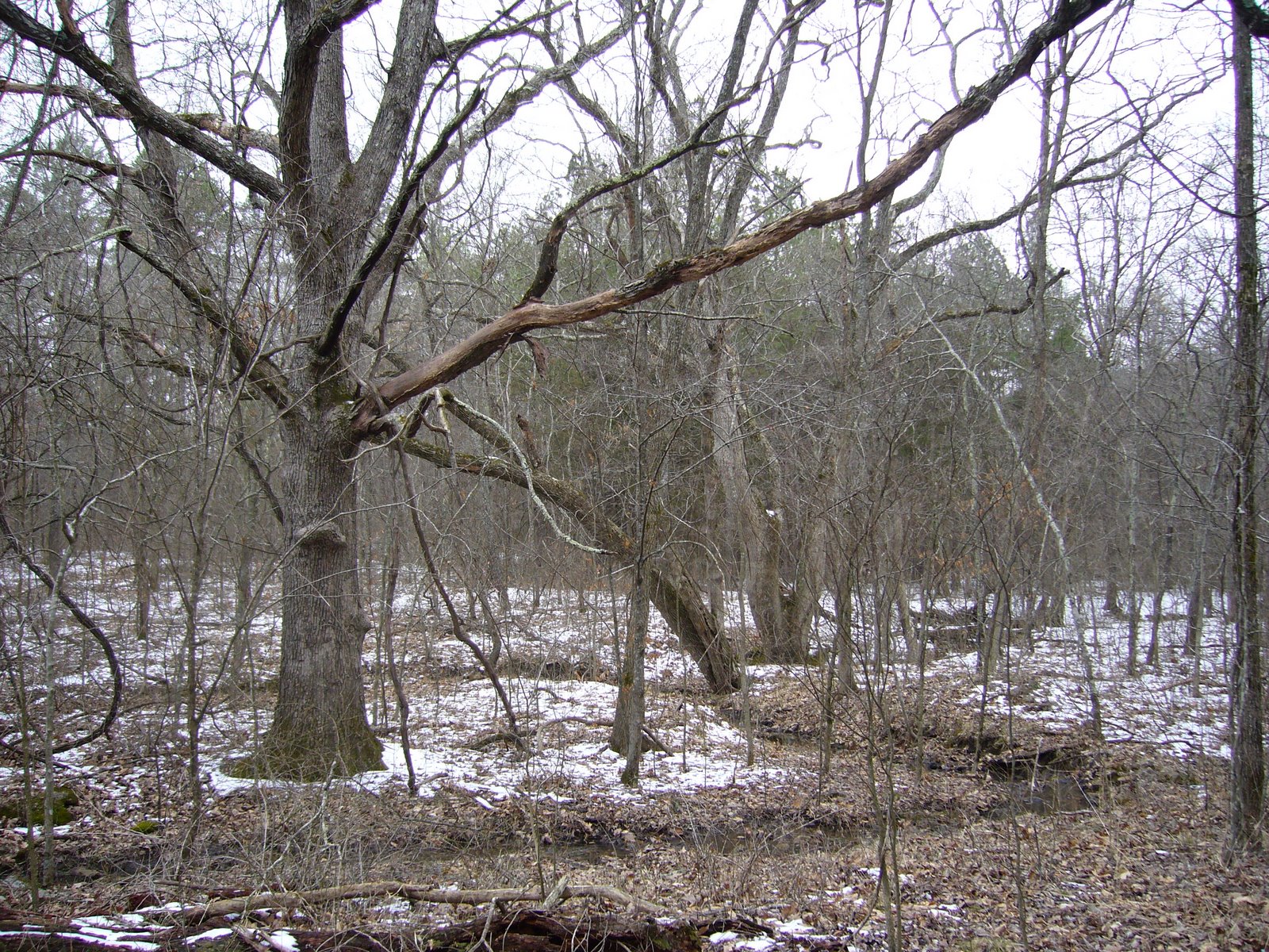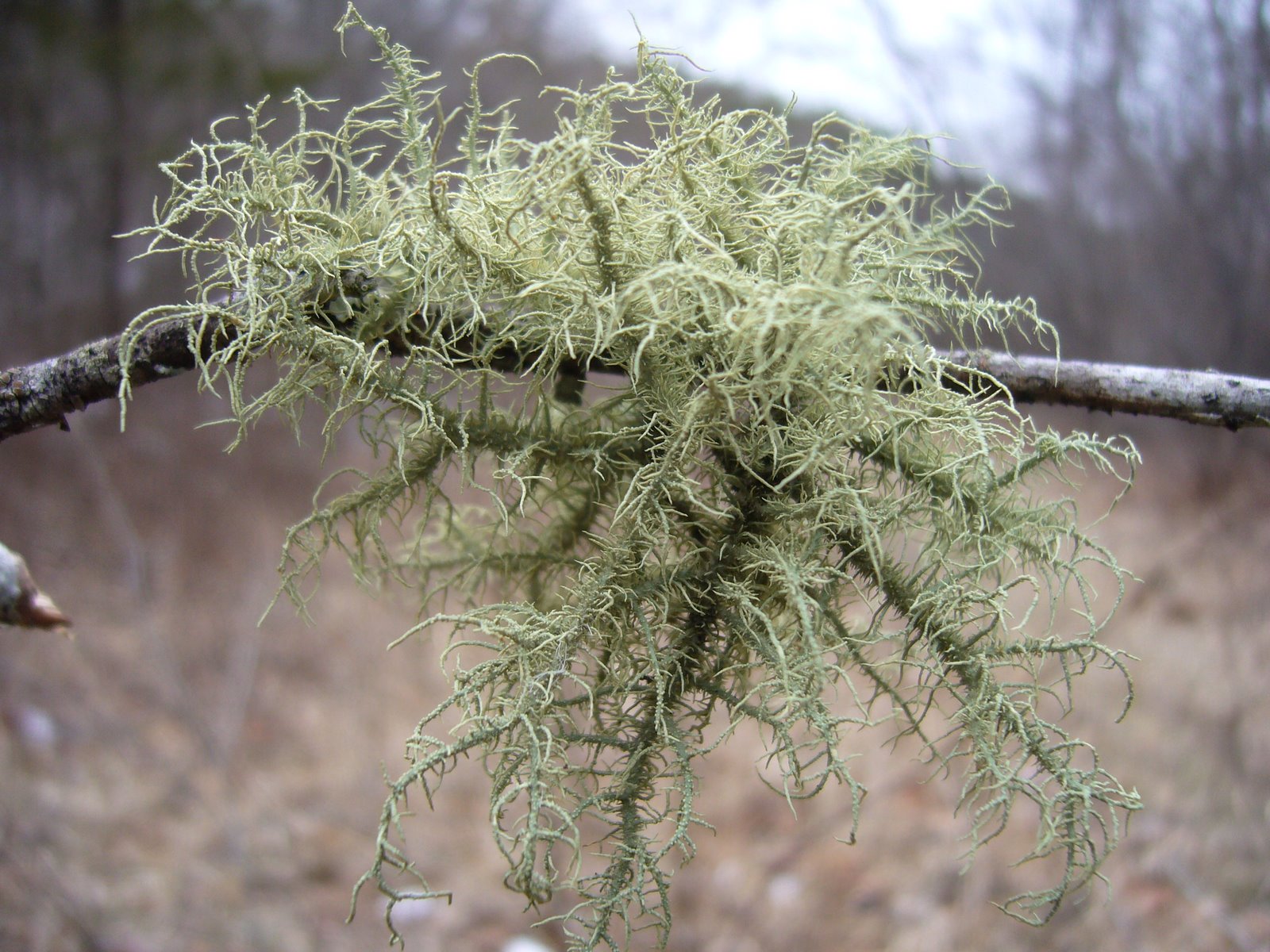 Back down into the lower reaches of Machell Hollow, evidence of prior settlement was obvious, as the bottomland forest in this area was replaced by young successional forest comprised primarily of chokecherry (Prunus virginiana), honey locust (Gleditsia triacanthos), and brambles (Rubus sp.). We saw this lone little fruticose lichen growing on a small honey locust. Apparently, of the three main groups of lichens, fruticose lichens are the most sensitive to environmental disturbance. Perhaps the existence of this one colony suggests that the health of this bottomland forest is returning as succession proceeds along the path to maturity.