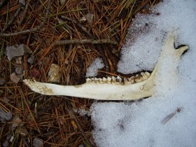 I love bones and pick them up whenever I get the chance. After leaving Boiling Springs I noticed this half mandible of a white tailed deer (Odocoileus virginianus) laying on the trail, still partially embedded in the snow. It was remarkably clean and complete, containing all of its dentition and with no remaining tissue except for a small piece attached to the nerve fossa. It’s completeness begged the question – where was the other half? We looked around and couldn’t find it. We then wondered if it had been dragged there by a scavenger, although we thought that if that was the case it should show signs of gnawing or at least have lost some of its dentition. At any rate, I have a white tailed deer cranium in my collection but not a mandible, so this will be a welcome addition.