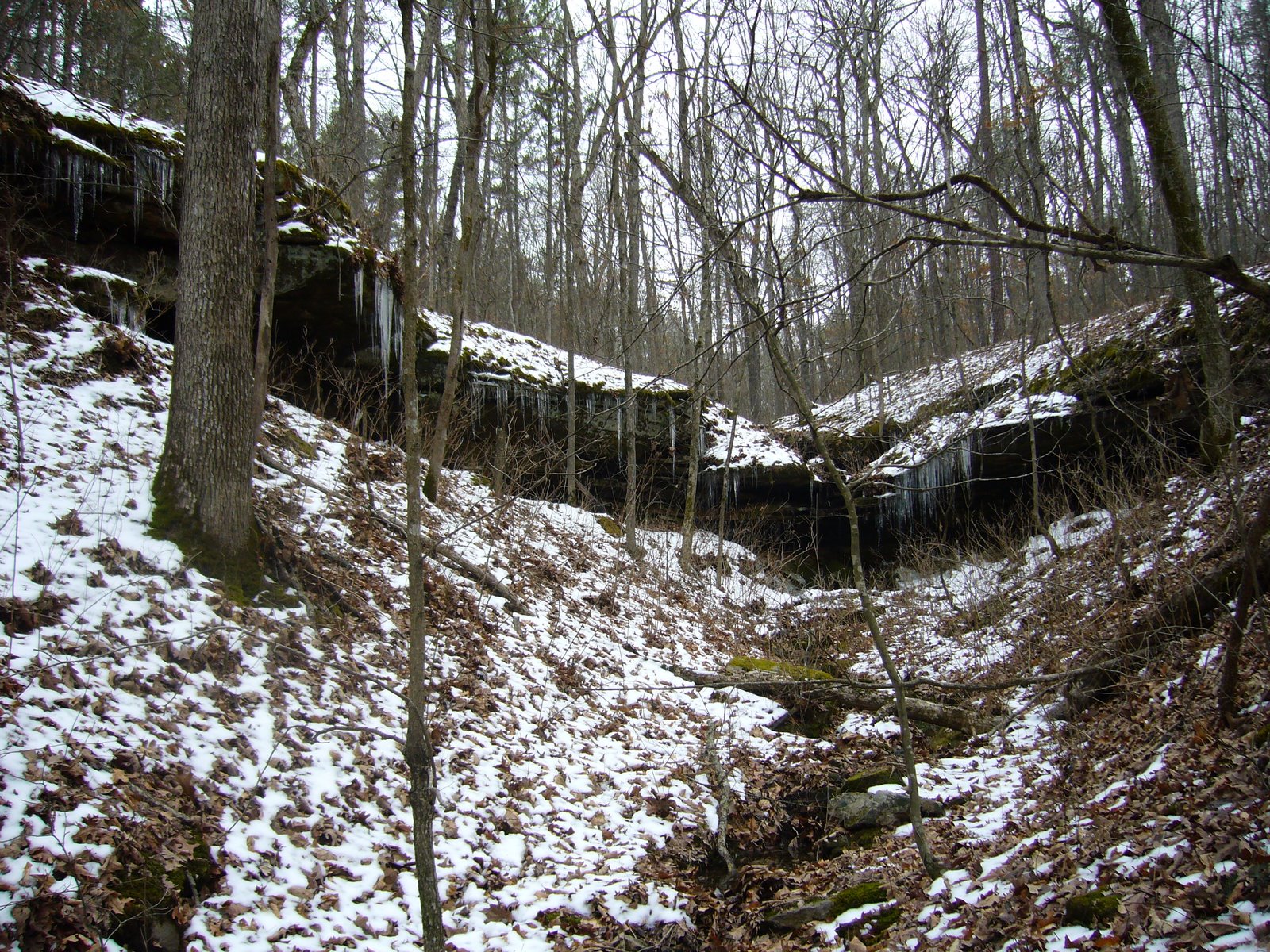 While ascending out of Machell Hollow, we noticed this small canyon about a hundred yards off to the left and decided to go investigate. Along the way we noticed the small creek coming from it was actually a ‘losing creek’ – which means that the water flows into the ground at certain points and is ‘lost.’ This is another feature of the limestone/dolomite-based Karst geology so common here in southern Missouri that results in its abundance of caves and springs. When we got to the canyon we saw it was comprised of a layer of sandstone. This must be a rare western exposure of the LaMotte sandstones that are more common just to the east in Ste. Genevieve County (see earlier posts on Hawn State Park and Pickle Springs Natural Area). This sandstone layer overlying dolomite has created an interesting geological feature, where a losing creek originates from a box canyon. Ice stalactites were dripping from the north facing slope of the canyon walls.