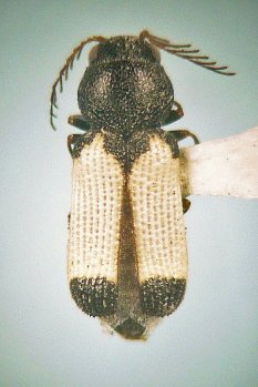 Trichinorhipis knulli is restricted to southern California and has been encountered most often in the vicinity of Mountain Springs in Imperial County (just north of the Mexican border), where it breeds in dead branches of jojoba, Simmondsia chinensis. Very few individuals have actually been observed in the field – most existing specimens have been reared from caged, infested branches (as is the case with this specimen, which emerged August 1994 from a dead branch I collected in October 1992 – patience prevails!). At only 3.6 mm in length, it is one of the smallest members of the family, but I think you’ll agree that it is just as impressive under the microscope as any of the larger members of the family. The genus is monotypic (although I hear rumor of an undescribed species from west Texas) and has been placed in its own subtribe (Trichinorphidina) within the Xenorhipidini due to unique characters that distinguish it from the other included genera (Hesperorhipis and Xenorhipis). These include its entire (not abbreviated) elytra and broadly rounded pronotum lacking lateral margins. In Hesperorhipis and Xenorhipis the elytra are abbreviated, and the pronotum is quadrate with distinct lateral margins. The organization of the antennal sensillae also differs between Trichinorhipis and these other genera.