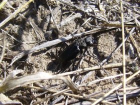 While admittedly harshly-sunlit, it is as far as I know the only field photograph of the species – all others that I’ve seen have been taken in terraria. I’ll fix it up a bit with Photoshop and re-post once I get back home. This species looks similar to the black morph of Cicindela purpurea audubonii, which co-occurs with C. nebraskana in Nebraska, but it lacks the bright white labrum and elytral markings of the former. Also, as I would learn during these past two days, it can be instantly recognized in the field by its shinier appearance and “stubbier” legs. A few days before my arrival, Matt succeeded in finding the species in the next county to the east, an eastern range extension of about 60 miles, and today I located the species at another new locality between the two. It is gratifying to have played a small role in increasing our knowledge about this unusual species.