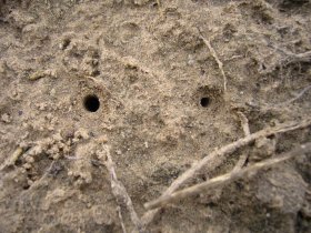 I went back to the spot today hoping to see some activity, but thick clouds and cool temps made that unlikely. This is when I decided to “go fishing.” Tiger beetle larval burrows are easily recognized by their perfect circular shape and clean “beveling” around the entrance (1st photo). Burrows of 3rd instars (the last larval instar in tiger beetles) are distinctly larger than those of 2nd instars (2nd photo), while those of 1st instars are smaller still (not shown). Larvae sit at the