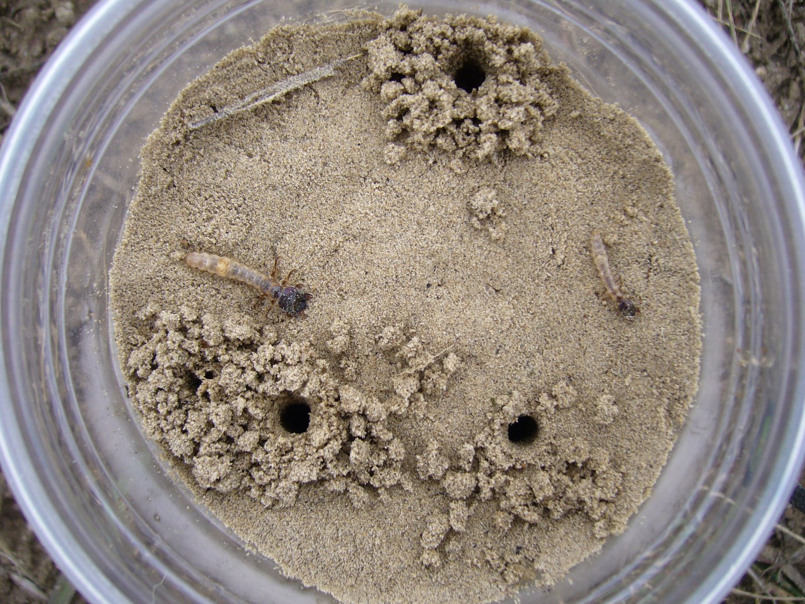 burrow entrance and ambush any suitable prey that comes too close. During cool, cloudy weather, however, they drop to the bottom of their burrow – up to a foot or more deep. A technique useful for extracting inactive larvae from their burrows is called fishing and involves inserting a thin grass stem down to the bottom of the burrow in an attempt to coax the larva into “taking the bait” and biting the end of the grass stem (3rd photo). The grass stem is then pulled up rapidly – much like setting the hook when fishing –