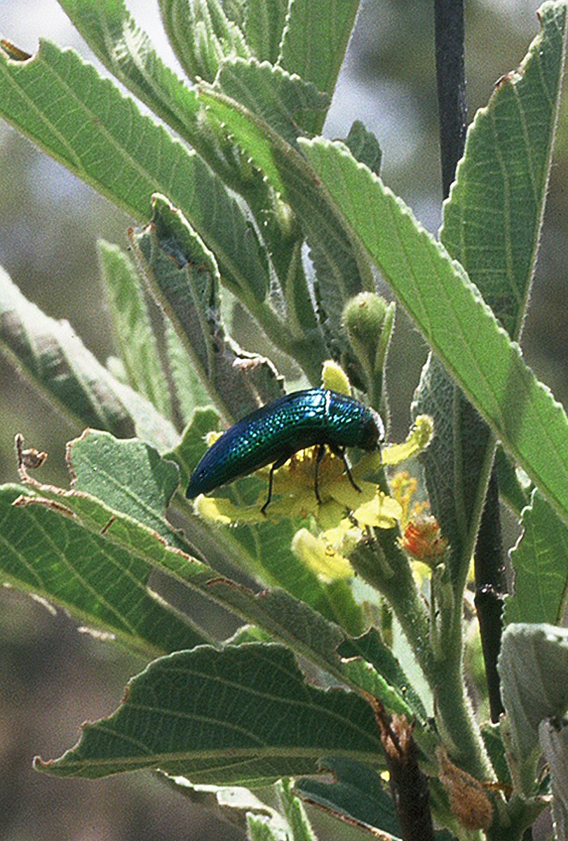 One of the most exquisite species that I collected was Anadora cupriventris – a very large (by coraebine standards), heavily sculptured species densely covered with curled swaths of gold and brown pubescence. I regret not having the opportunity to photograph the single individual that I found. Another impressive species that I was not able to photograph was Agrilus (Personatus) sexguttatus, surely close to, if not the largest species in the genus and boldly patterned with black and rust red spots on olive green. One last species for which I have no images but is worthy of mention is an undetermined species of the genus Pseudagrilus. Looking like a chunky, brilliant green Agrilus with saltorial (jumping) metafemora, adults would “pop” off the Solanum plants on which they were found as soon as I looked at them. I eventually decided that “Flipagrilus” would have been a more appropriate name for the genus. All told, I collected some 66 species of Buprestidae, including several genera not previously represented in my collection (e.g., Brachmaeodera, Brachelytrium – a few becoming paratypes of new species then being described by Chuck Bellamy and Svata BĆlý, Chalcogenia, Galbella, and many of the other above mentioned species). I should mention the assistance of Chuck and Svata for helping me with some of the identifications, as well as Gianfranco Curletti who identified all of the material in the difficult genus Agrilus. I sincerely hope that I have another chance to visit this incredible land of beauty and contrast!