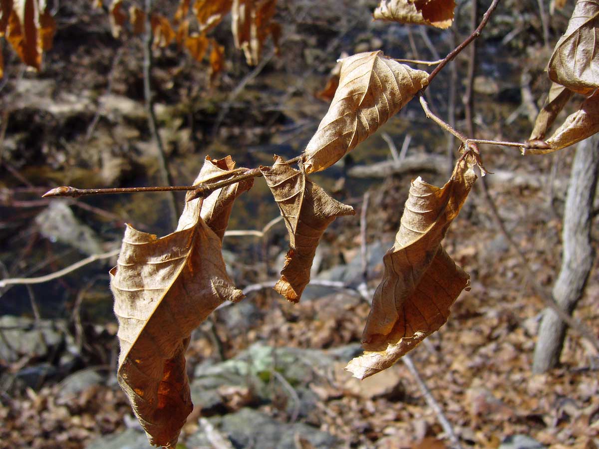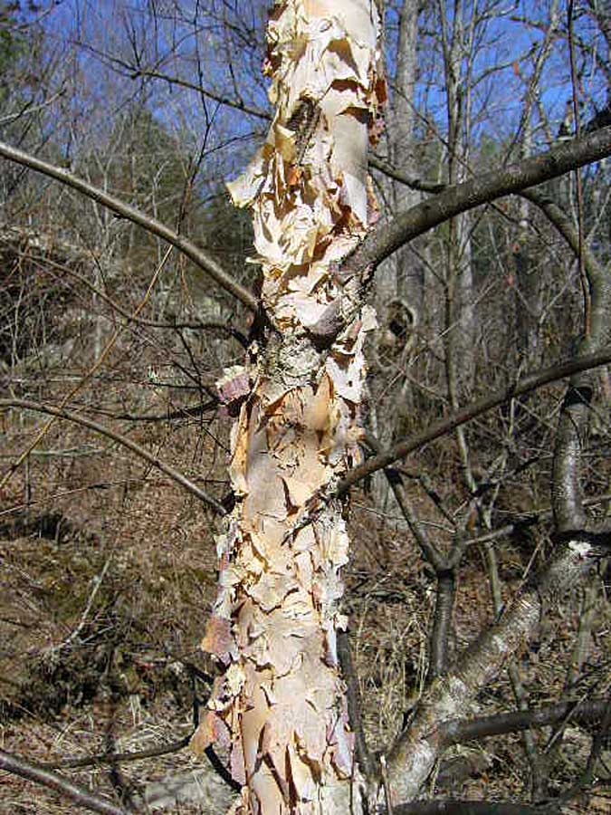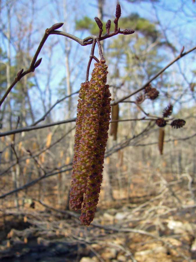 One of these streams is Pickle Creek, which is fed throughout the year by Pickle Spring and has in some places cut all the way down to the underlying igneous rock to form “shut-ins.” In contrast to the slow, sandy bottomed stretches where Pickle Creek is still cutting through sandstones, the water in these igneous shut-ins rushes through narrow openings in the highly resistant rock. The igneous and sandstone exposures found in Hawn are spectacularly beautiful and support a unique flora due to the acid soils they produce. One group of plants that have taken sanctuary in these moist, acid soils is the Betulaceae, or birch family. Missouri is home to five native species of Betulaceae¹, and while none of them are extraordinarily uncommon they are limited in their occurrence to natural communities with sufficient moisture and exhibit a clear preference for acidic soils. This confluence of conditions occurs perfectly along Pickle Creek, allowing all five native species to grow here side-by-side – a betulaceous “hot spot” that represents not only the full diversity of the family in Missouri, but also the total generic diversity of the family in North America. In fact, only one other genus (Ostryopsis, shrubs related to Corylus and restricted to China) is assigned to the family on a global basis (Furlow 2004).