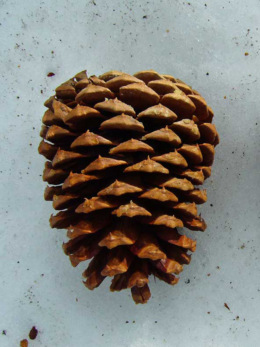 Despite the widespread occurrence of this species across the mountainous west, I knew this species was not common in the Tahoe Basin as it prefers somewhat lower elevations than Jeffrey pine. The U.S.D.A. Forest Service representative told me that I should be able to find this species in Emerald Bay State Park, and that proved to be the case. This species is so similar to Jeffrey pine that it is more useful to discuss the differences only. The photograph in Winter botany quiz #3 shows the more yellow, larger plates of the bark on mature trees that is usually cited as a distinguishing character, but I found this to be unreliable in deciding whether a large tree represented this species or Jeffrey pine. On several occasions I made a judgment based on the bark and then had to change my mind after looking at the fallen cones underneath. Furthermore, this character was useless for younger trees that have not yet developed the distinctive plating. Another character often cited is the shape of the crown, which in ponderosa pine is generally shorter and less symmetrical than that of Jeffrey pine and results in the branches starting higher up the trunk in mature trees. I didn’t develop any confidence in this character either. It was not until I started focusing on the fallen cones beneath each tree that I developed a consistent sense of which species was which. In contrast to the robust cones of Jeffrey pine, those of ponderosa pine were almost always slightly smaller, with a more open structure and – most obvious – were very prickly to hold due to the prickles of open cones curving outwards.