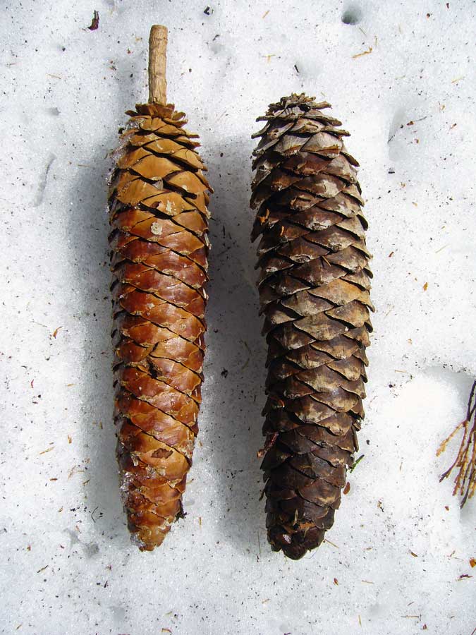 The photo at right shows the distinctly outward pointing prickles and more open structure of a ponderosa pine cone (left) versus the distinctly inward pointing prickles of a Jeffrey pine cone (right).