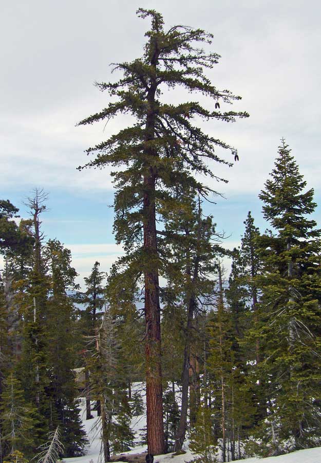 This species was the dominant pine at lake level around the entire perimeter of the lake. It also dominated the forests I saw at Spooner Lake (elevation 7,200′), and I saw a few specimens as high as about 8,000′ elevation at Heavenly Ski Resort. The photo at right shows this species (right) standing next to red fir, Abies magnifica (left) on the California side of Heavenly. I also found it outside Tahoe Basin on the western slope of the Sierra Nevada down to Pyramid Creek Geological Area at an elevation of about 6,200′. At that point, ponderosa pine began to take over and dominated at lower elevations.