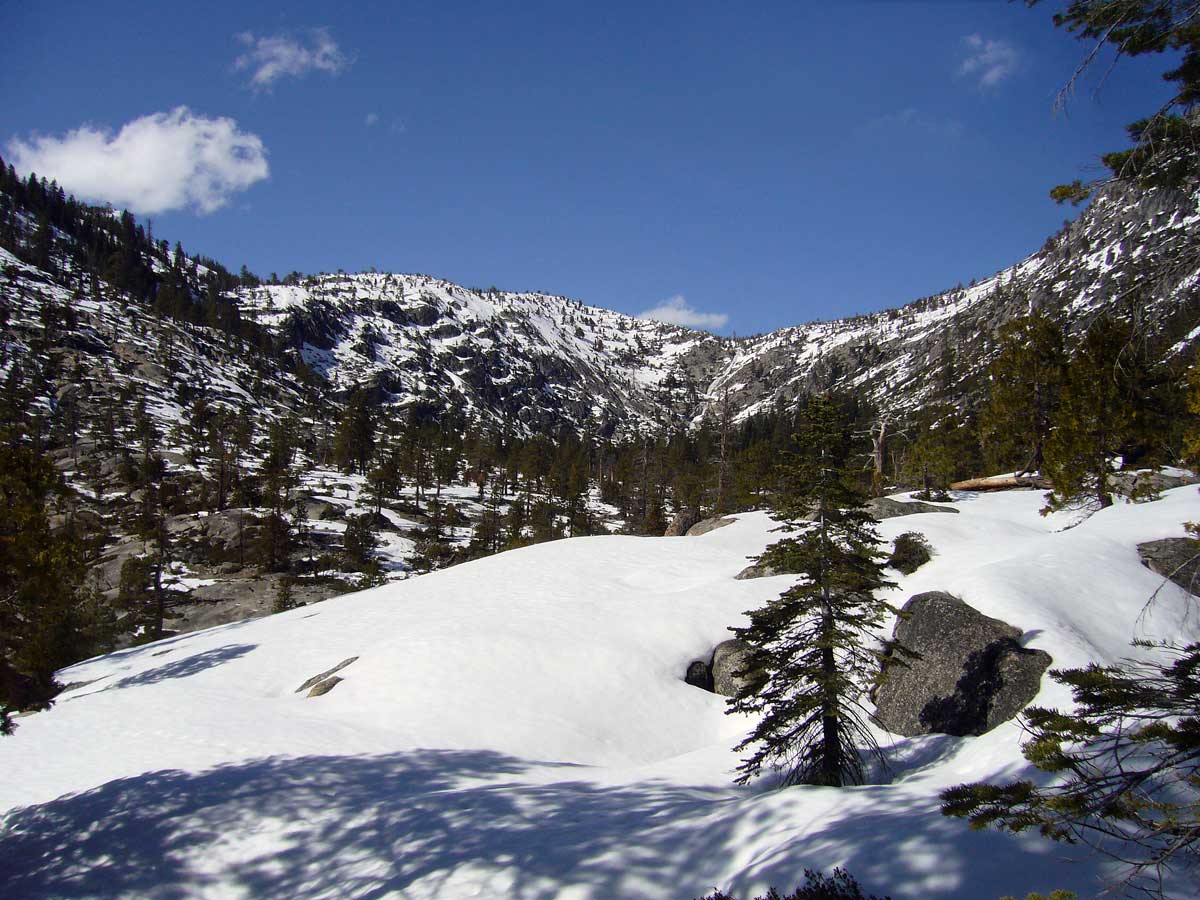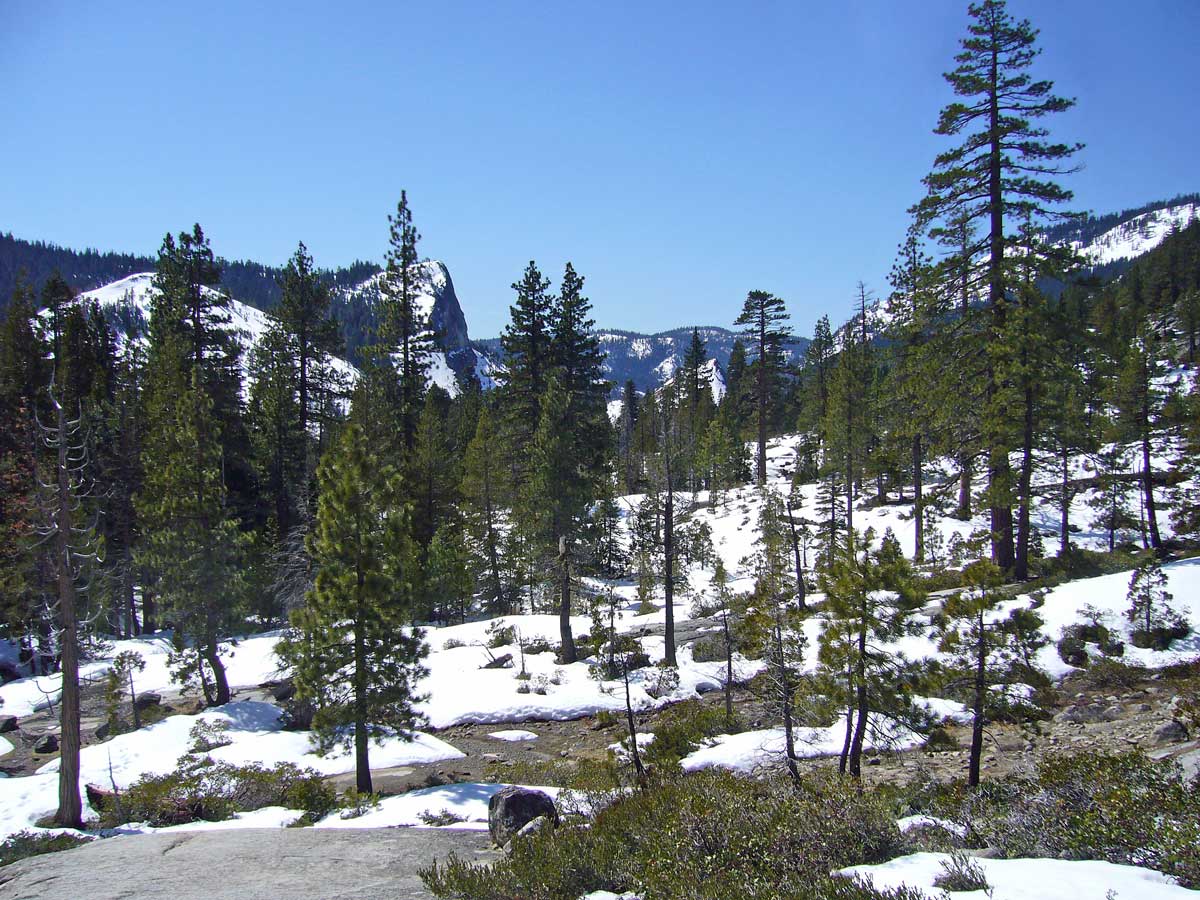 I found this species sporadically throughout the forests along the Vikingsholm and Rubicon Trails when I hiked Emerald State Park; however, the best stands were seen in the meadows along the Upper Truckee River near the city of South Lake Tahoe and while cross-country skiing around Spooner Meadow near Spooner Lake in Nevada (elevation about 7,000′). This species likes moisture and is the dominant pine in the many wet meadow areas that are found in the Tahoe Basin. The photo below was taken at Spooner Meadow and shows the stands of lodgepole pine in the meadow, with Jeffrey pine taking over on the elevated hillsides.