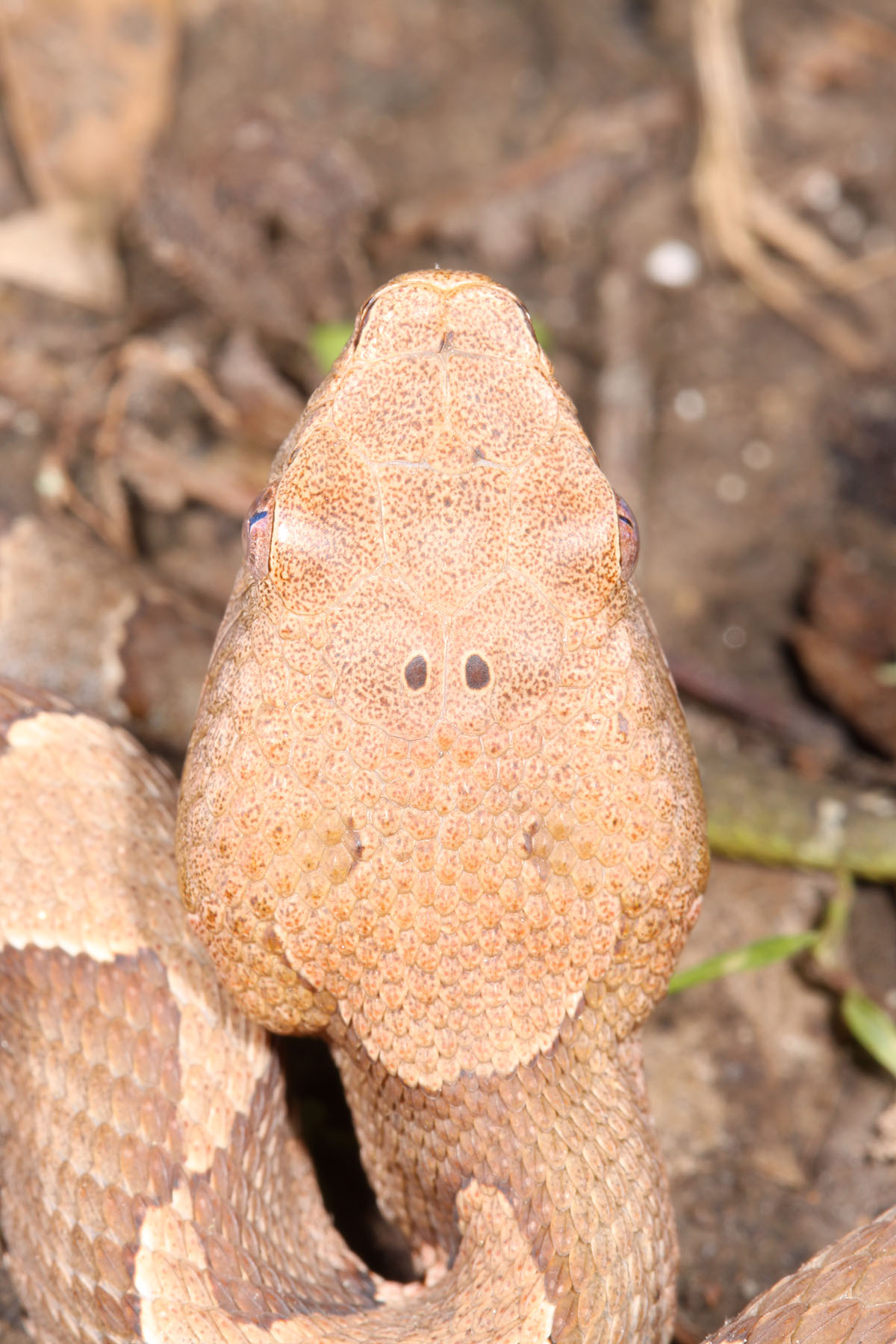 Missouri copperheads don’t really have “copper heads” – the common name is derived from the northern subspecies that lives in the northeastern U.S. and down into Appalachia. Instead, most of Missouri’s copperheads have a pinkish tan head that matches the color of the body. Three of North America’s five copperhead subspecies live in Missouri, but it is the Osage copperhead (A. contortrix phaeogaster) that is most commonly encountered – the northern and southern subspecies being confined, respectively, to the extreme northern and southern portions of the state. Osage copperheads are distinguished by the light bordering around each of their dark markings.