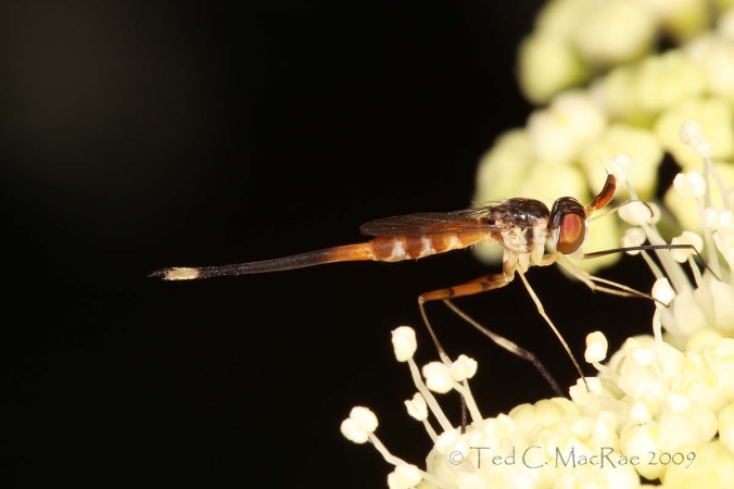 From Overlooked, needle-bellied, thick-headed fly (Aug 14). One of my first good “black background” shots. The white tip of the abdomen compliments the white flower stamens against the background.