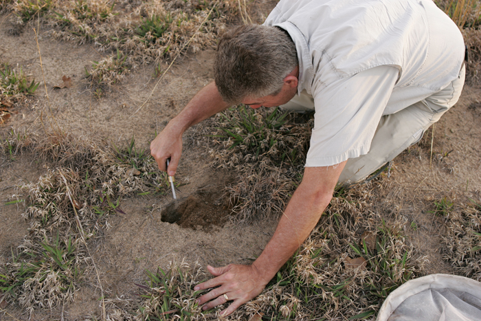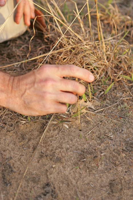 Ted fishes for a tiger beetle larva in a sand prairie relict.