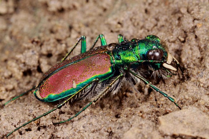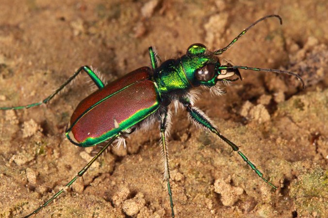 While I still have much to learn, one thing I did realize is that lighting remains a challenge even with a decent setup such as mine.  The MT-24Ex flash unit, in particular, while seemingly the flash of choice among Canon-using amateur insect macrophotographers, produces a very harsh light.  The capabilities and shortcomings of this flash unit have been reviewed in great detail by several insect macrophotographers much more knowledgeable than I (e.g., Alex Wild, Dalantech, Kurt, etc.), so I simply refer you to their websites if you’re interested rather than try to summarize here.  However, the one thing they all emphasize with this flash unit is the need for diffusers.  Diffusing light is easy; a simple sheet of tracing paper will do.  However, diffusing light in a manner that is equally effective with both the 65mm and 100mm lenses (with their shorter and longer working distances, respectively) and also convenient for field-use is hard.  For most of the 2009 season, I tried using Sto-Fen Omni-Bounce Diffusers, and while they were marginally better than no diffusers at all, the results were still not satisfying.  More recently, I’ve been experimenting with the Gary Fong Puffers, which Dalantech has modified for use with the MT-24EX.  I hadn’t yet committed to constructing the diffusers as described and conducting controlled comparisons between the Puffers and Sto-Fens, but my initial tinkering with the Puffers has me impressed.  Below are two photos of Cicindela splendida (the aptly-named Splendid Tiger Beetle) – the first (which some of you may remember from this post) was taken in the field using the Sto-Fen diffusers and the 65mm lens (1X)…