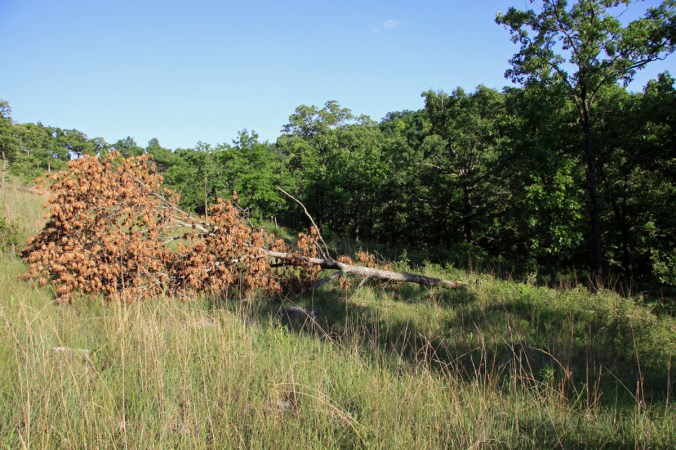 One of the few highlights of my Memorial Day weekend collecting trip came in the earliest moments of my visit to Ha Ha Tonka State Park.  My destination was Ha Ha Tonka Savanna Natural Area, and a short walk through fire-restored woodland led me to the open glade where just a few years earlier a UMC student had collected the rare and little-known Agrilus impexus.  Entering the glade, I was all set to begin sweeping the vegetation along the woodland/glade interface, paying special attention to any honey locust (Gleditsia triacanthos) that I might happen to find in the area as a potential host for the beetle.  What I saw instead as the glade opened up in front of me was a sight that any collector of wood-boring beetles will find almost irresistable – a recent wind-throw!  In this case, it was a black oak (Quercus velutina) laying in full sun – its bright brown leaves suggesting that it had fallen within the past few weeks (and would thus still be emitting the volatiles that wood-boring beetles find so attractive).  I wanted to begin looking for A. impexus, but I knew there would be beetles actively crawling on the trunk and branches of that tree.  I couldn’t resist it – I dropped my sweep net and beating sheet and made my way to the tree (in the end it didn’t matter, since no other beetles – including A. impexus – would be seen that day).