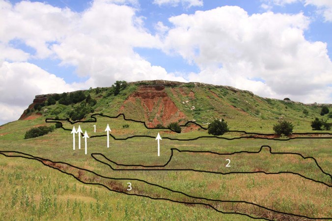 Occurrence of Amblycheila cylindriformis. White arrows indicate where adults were found, all of which were on red clay/gypsum exposures on lower talus slopes in native prairie habitat. No adults were seen in clay/gypsum exposures further below the slopes in either native (zone 1) or altered prairie (zone 2) or further down in roadside drainages (zone 3).