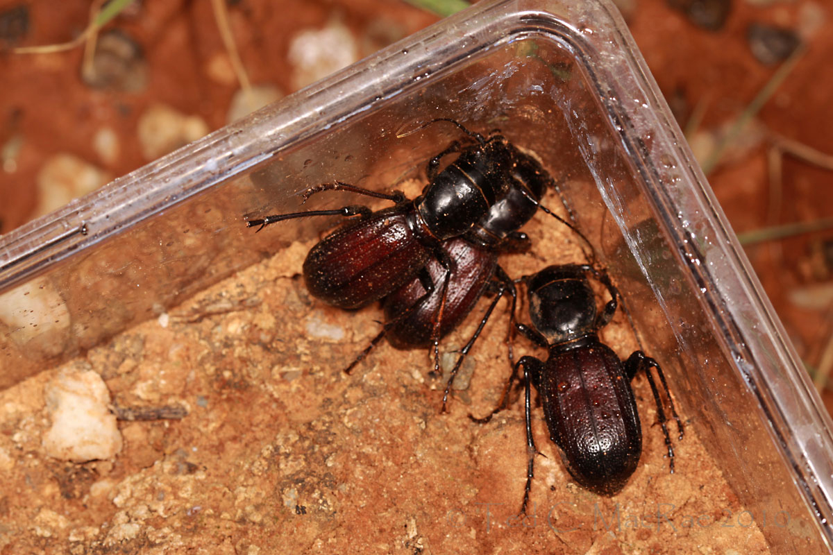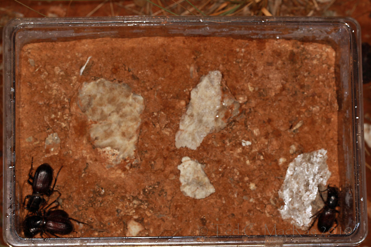 Finding the first individual did wonders for my motivation, and though still nervous about the potential for rattlesnakes I continued searching an ever-widening swath of the talus slope and adjacent areas. Another hour passed, and I had searched not only the native prairie below the talus slopes, but clay exposures on adjacent somewhat altered habitat. Again, the negative thoughts started creeping back into my mind – am I really gonna walk away from here with a single individual? I can say I found it, but that was a long drive for one beetle! I continued searching along an adjacent drainage ditch, and by 11:30pm I conceded that my victory was small and walked back to the truck to get a container to fill with native soil for a terrarium. Though it was a bit of a walk back up to the talus slope where I had seen the larval burrows, I wanted to take soil from that area specifically to give myself the best shot at obtaining eggs from my single (hopefully female) individual for an attempt at rearing more specimens from larvae. As I approached the exact spot where I had collected last year’s larva, I saw another, even larger adult! I don’t know which was greater – my excitement at finding such a large individual, or my relief in knowing that I would not go home with only one. Of course, with the second individual came a new shot of motivation, so once again I scanned across the talus slopes, and during the next half hour I found two more very near to where I had found the second one. By then it was past midnight, so I set about the business of digging soil for the terrarium. I finished the job (getting stung something terrible by three red, big-headed ants that had crawled up my pant leg while I was digging), took one last sweep across the immediate area, and turned to walk back to the truck when I saw the biggest one of all – I later determined it to be a male measuring 35 mm in length (that’s just about an inch and a half, folks!). With five individuals now, the urgency to find more was gone, and I decided I’d done what I needed to do and should get into town and find a hotel room. As I walked back to the truck, rain began to fall – lightly at first but ever increasing. Once back at the truck it was raining persistently enough that I could only hurriedly take some quick photographs of the beetles in their terrarium as in situ documentation of the momentous occasion!