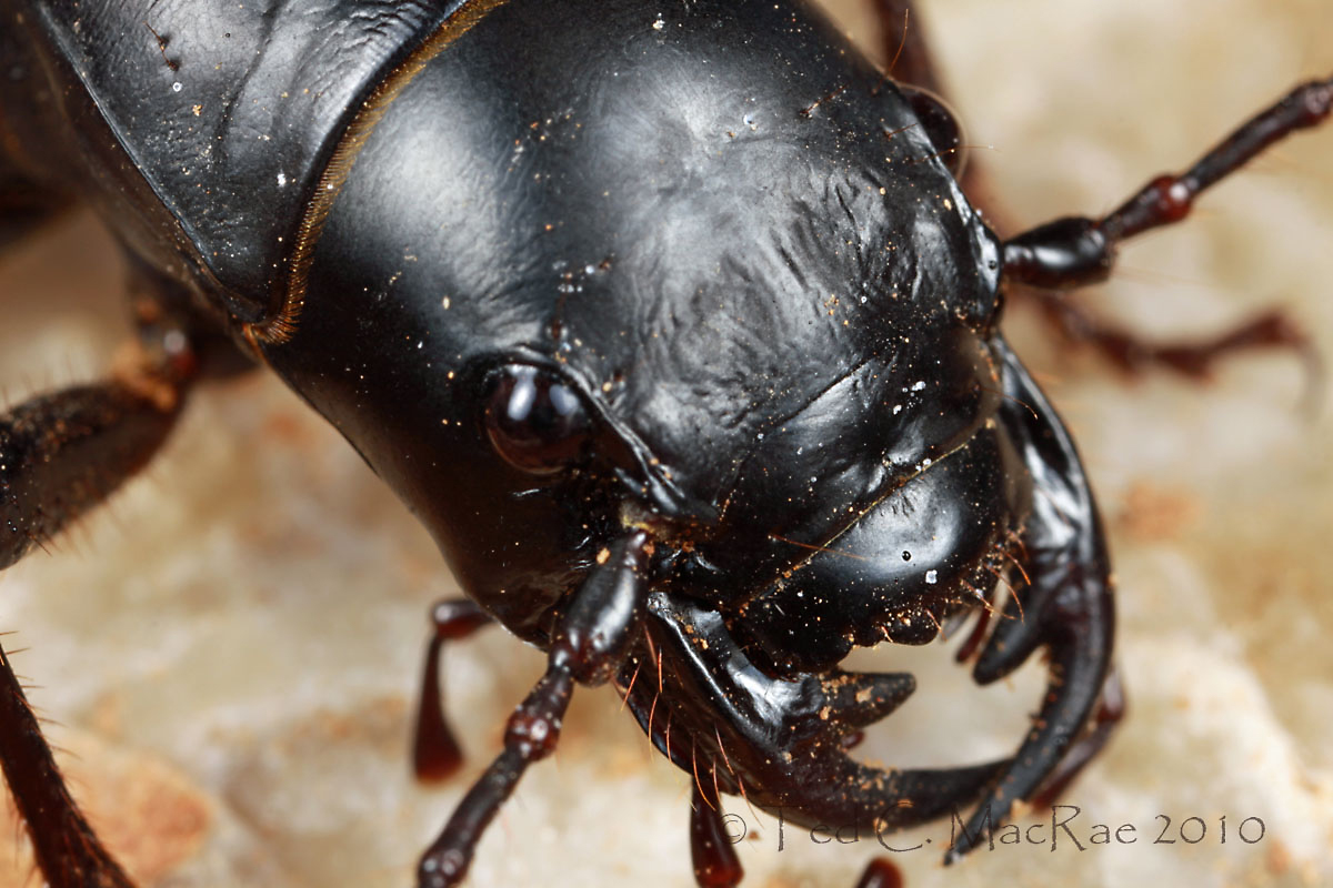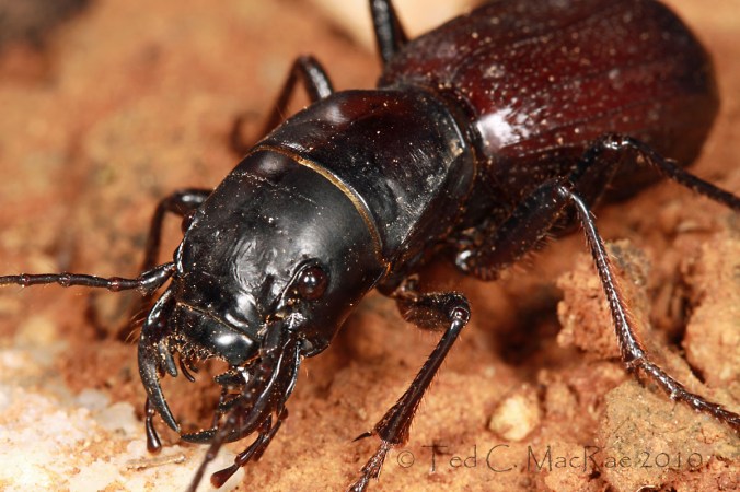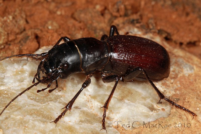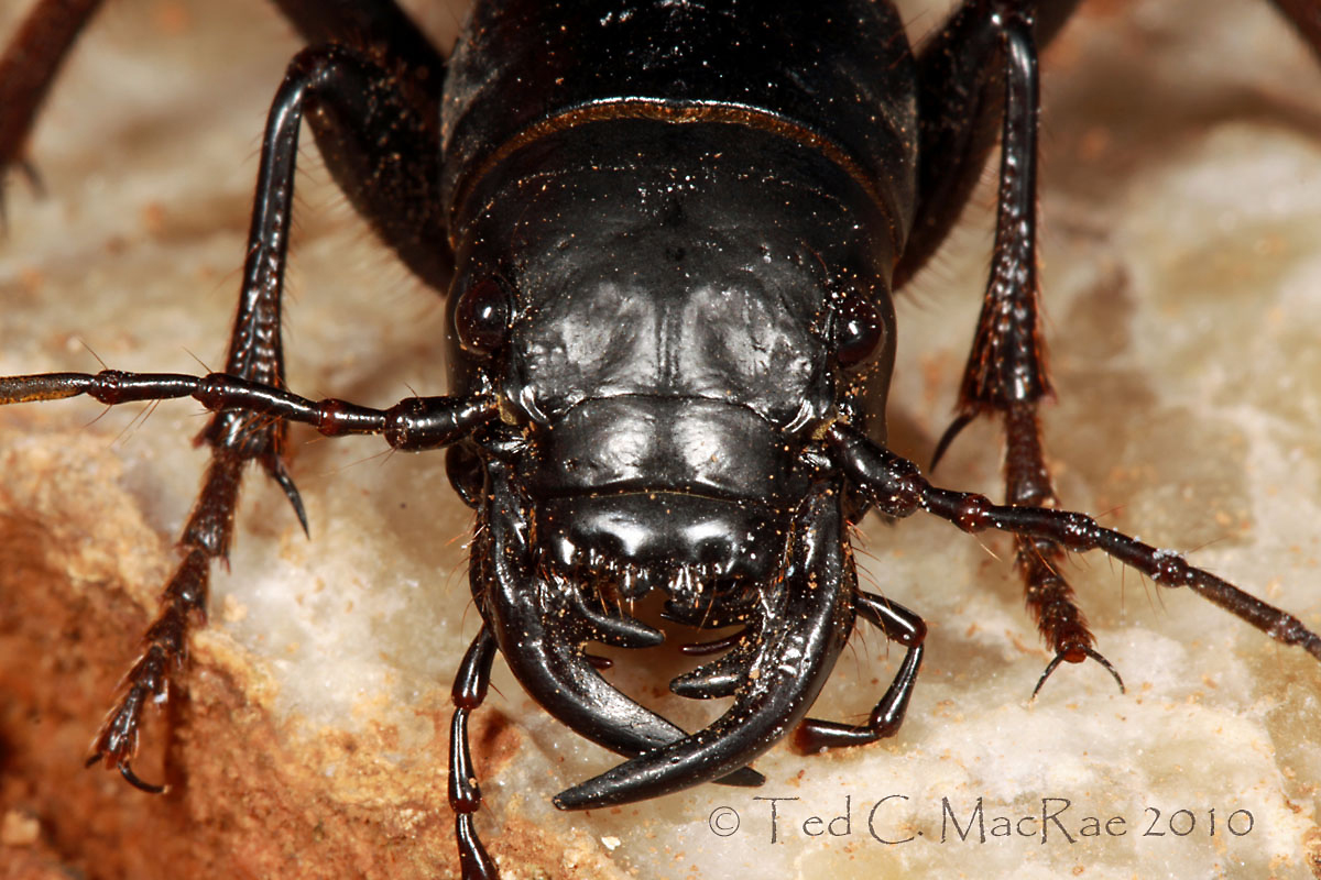 Of course, all this was really just passing time – waiting for nightfall and hoping the rain continued to hold off so I could begin searching the prairie down below for A. cylindriformis. It had sprinkled once or twice during the day, and I couldn’t tell if the darkening western sky was truly rain or the just the coming dusk. At 9pm, with darkness fast approaching, I set out with my headlamp and made a beeline for the native prairie habitat on the lower talus slopes where I had last year collected the larva and observed additional larval burrows that I took to be the same species. I must admit that the thought of walking alone through the prairie at night in western diamondback rattlesnake habitat made me more than a little nervous, and I kept just as much an eye out for them as I did the tiger beetles that I was looking for. As the night wore on, my hopes began to dim – I had searched for almost an hour and had covered most of the area where I had seen larval burrows last year. With no sign of the beetle, the negative thoughts started to enter my head – did I make this drive for nothing? How sure was I that the larva really represented Amblycheila? Did I have the right search image? I mean, they’re huge black beetles – they should be easy to spot, right? Oh great, I made all this fuss on my blog about looking for the species – how embarrassing to have to say, “Uhm, well, I didn’t find it.” Just as I began wrapping back around the bottom of the talus slope, there it was – no doubt about it! I just watched it for a while and noted that it moved with some urgency, but it was not the speedy, jerking walk of ‘regular’ tiger beetles – rather, it was more lumbering, seeming to pick each foot up rather high, like a cat with rubber bands on its feet (how would I know about that?). There seemed little risk of it escaping me, so I got out the camera and began following it to take photographs – no way! While it may have lacked the speed of other tiger beetles, it also lacked their propensity to occasionally pause long enough to allow a shot or two. Add the darkness, fear of rattlesnakes, and constant bumping of the flash unit on my headlamp, and it was soon apparent that getting good field photographs was going to be a low percentage proposition. I resigned myself to taking photographs later in a terrarium (several shown here) and spend my time in the field more productively looking for additional individuals.