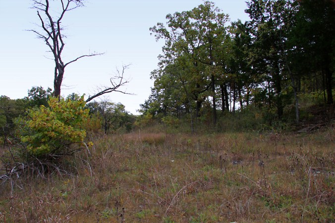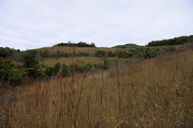 Russet browns of big bluestem (Andropogon gerardii) and Indian grass (Sorgastrum nutans) blend with still-green foliage in early autumn at White River Balds Natural Area in southwestern Missouri.