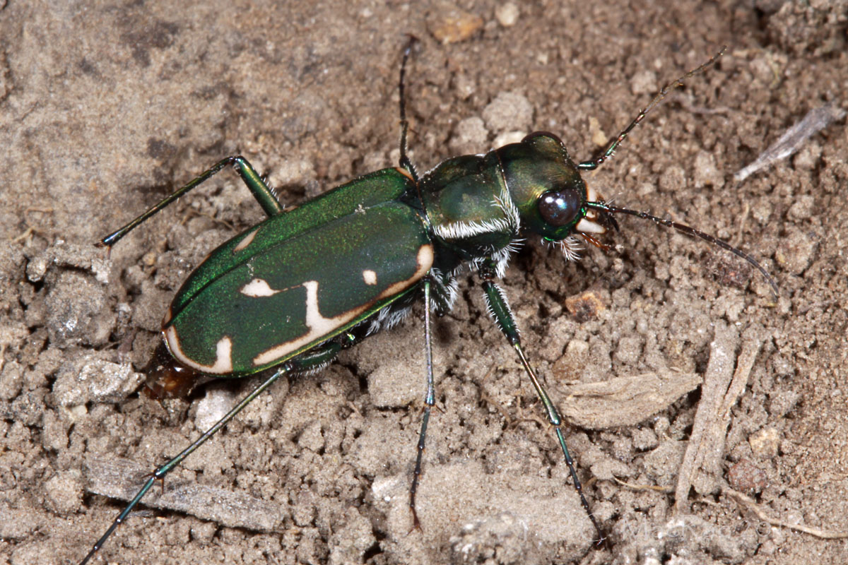 A female Prairie Tiger Beetle oviposits in a rearing container of native soil.