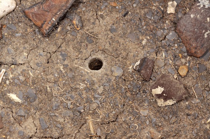 Cicindela pulchra is a “spring/fall” species – i.e., sexually immature adults emerge during fall to feed, then return to their burrows to overwinter before emerging again in spring to mate and lay eggs. Pearson et al. (2006) state the fall period lasts from July to September; however, as I observed in Kansas in 2005 adults can remain active well into October as long as suitable weather prevails. Larvae hatch shortly after eggs are laid in the spring, but larval burrows can be seen during the entire season since they require 2-3 to complete development. It was actually the presence of the large larval burrows (see photo below) that alerted Matt to the occurrence of the species at this site. Several other tiger beetle species are also found here, e.g. C. purpurea (cow path tiger beetle) and C. tranquebarica (oblique-lined tiger beetle); however, these species – and hence their larval burrows – are considerably smaller than C. pulchra. The only other species of Cicindela in North America that matches C. pulchra in size is C. obsoleta (large grassland tiger beetle), a southwestern species that is not known to range as far north as Nebraska and South Dakota, and the slightly smaller C. formosa (big sand tiger beetle) larval burrow has a distinctive “pitfall trap” with the burrow opening situated horizontally above it (it is also restricted to dry sand rather than clay habitats). We saw several C. pulchra larval burrows during our visit but no active larvae, and none of my attempts to “fish” them out of their relatively shallow burrows met with success. I could have tried digging them out, but that is a time-intensive activity, and I decided instead to bring a few live adults back in a terrarium of native soil and see if I could rear the species from egg.
