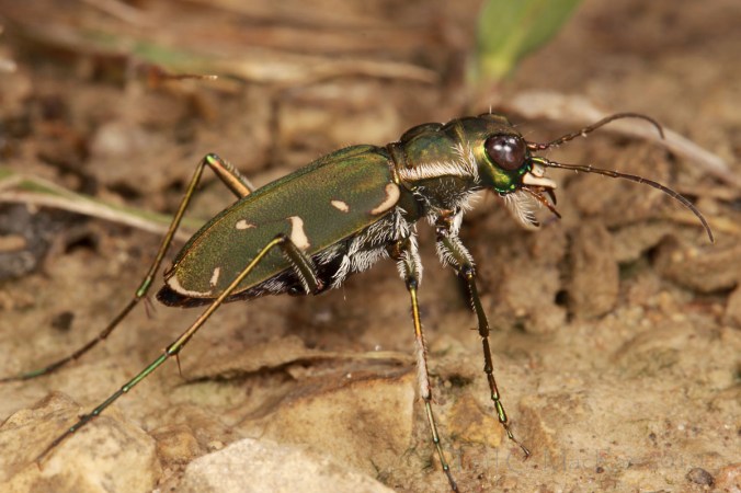 Currently, I have 3rd-instar larvae that I collected from their burrows at Blackjack Knob (adults mostly green) and Merriam Woods (adults mostly brown) and hope the rear them to adulthood next year. If I succeed in getting virgin adults from the two sites, I think it would be interesting to do some single-pair crossings and rear the progeny to see how coloration is expressed. A long term project, for sure, as these beetles probably require at least two seasons to reach adulthood, but rearing them is fun! A more difficult, yet far more interesting, project would be to secure virgin adults from the mostly black main population in Texas – or even the bright green, thickly-maculated santaclarae subspecies from Arizona – to see how interbreeding them with these Missouri disjuncts would affect coloration and maculation in their progeny – they could be some of the most unusual appearing large grassland tiger beetles ever seen (not to mention their tongue-twisting taxonomic moniker of Cicindela (Cicindelidia) obsoleta vulturina [Missouri disjunct] x obsoleta santaclarae!). Timing would be a difficulty, since the Texas and Arizona populations exhibit a more normal summer adult phenology, but it would be worth a try if I could secure a source of larvae for rearing. Anybody?