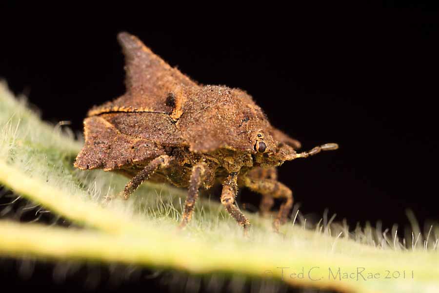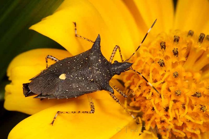 This was not an easy photograph to get – I found the weevil clinging to the underside of a leaf above my head. It was impossible to photograph it in situ, so I moved it to a low twig away from other foliage where I could get the black background I desired. Once moved, however, the weevil just never… stopped… crawling. Snapping shots of an actively crawling insect is a crap shoot at best – not only are focus and framing more difficult to nail, but subjects photographed while moving almost always have one or two “bum” legs (lifted or cocked out of position). A number of attempts were required to get a photo I was happy with (save for the slightly clipped antennal tip). In such situations, I’ve found it best to track the beetle as it moves and as soon as the center focus point of the lens flashes take the shot. This at least gives the best chance for nailing the focus, and then it’s simply a numbers game to get a shot with good framing and composition and all the body parts well placed. Of course, I could’ve zoomed out and just cropped to perfection, but this feels a little like cheating – I’d rather put in the time and practice perfecting my game out in the field as much as possible. An occasional clipped antenna, tarsus, etc. now will lead to better results down the line.