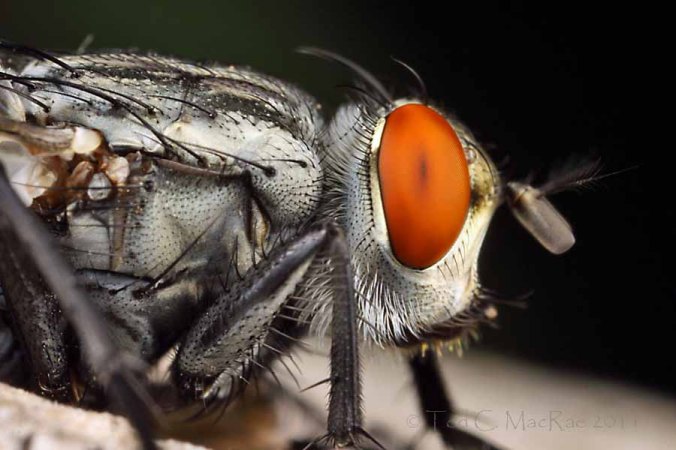 Here is the full-sized photo from which the “super-crop” featured in Super Crop Challenge #4 was taken. As many of you guessed, this is a higher fly (order Diptera, suborder Brachycera) in the family Sarcophagidae, with the photo crop showing frontal portion of the head and its associated structures. While dubbed “flesh flies” due to the necrophagic habits of a few of its included species, sarcophagids actually display diverse life histories that include a wide variety of coprophagous and parasitic species (Mulieri et al. 2010). The fly was one of the many insects I photographed in early March in Buenos Aires, Argentina at La Reserva Ecológica Costanera Sur, where it was found perched on dead wood (I found several individuals of apparently the same species perched on dead wood as well – whether this is significant or chance I don’t know).