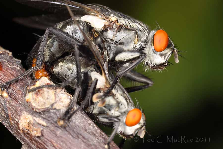 The presence of a ptilinal fissure and lunule and a dorsal seam on the antennal pedicel identify this as one of the calyptrate “muscoid” (schizopheran to be more correct) flies. Within that group, my determination as a member of the family Sarcophagidae is based on its fairly large size, dull gray coloration with three longitudinal black strips on the mesonotum, notopleuron with two strong and two small setae (Calliphoridae have only two setae), and meron with a row of setae (lacking in Muscidae and related families). Admittedly these characters aren’t visible in the cropped photo that I presented, so guessing the proper family was a bit of a crap shoot. As noted by (de Carvalho and de Mello-Patiu 2008), species determination of sarcophagid flies is complicated by their fairly uniform chaetotaxy and lack of useful external characters, leaving male genitalia as the only reliable characters for identification. No suitable key for identifying Neotropical genera yet exists and the elaboration of one will be very difficult without analysis of the male terminalia. Dr. Luciano Patitucci (Consejo Nacional de Investigaciones Científicas y Técnicas, Buenos Aires, Argentina) suggested this is perhaps a species of Sarcophaga; however, in a recent faunal study of Sarcophagidae at the reserve, two species – Tricharaea (Sarcophagula) occidua and Oxysarcodexia varia – comprised nearly 90% of the flesh flies encountered (Mariluis et al. 2007).