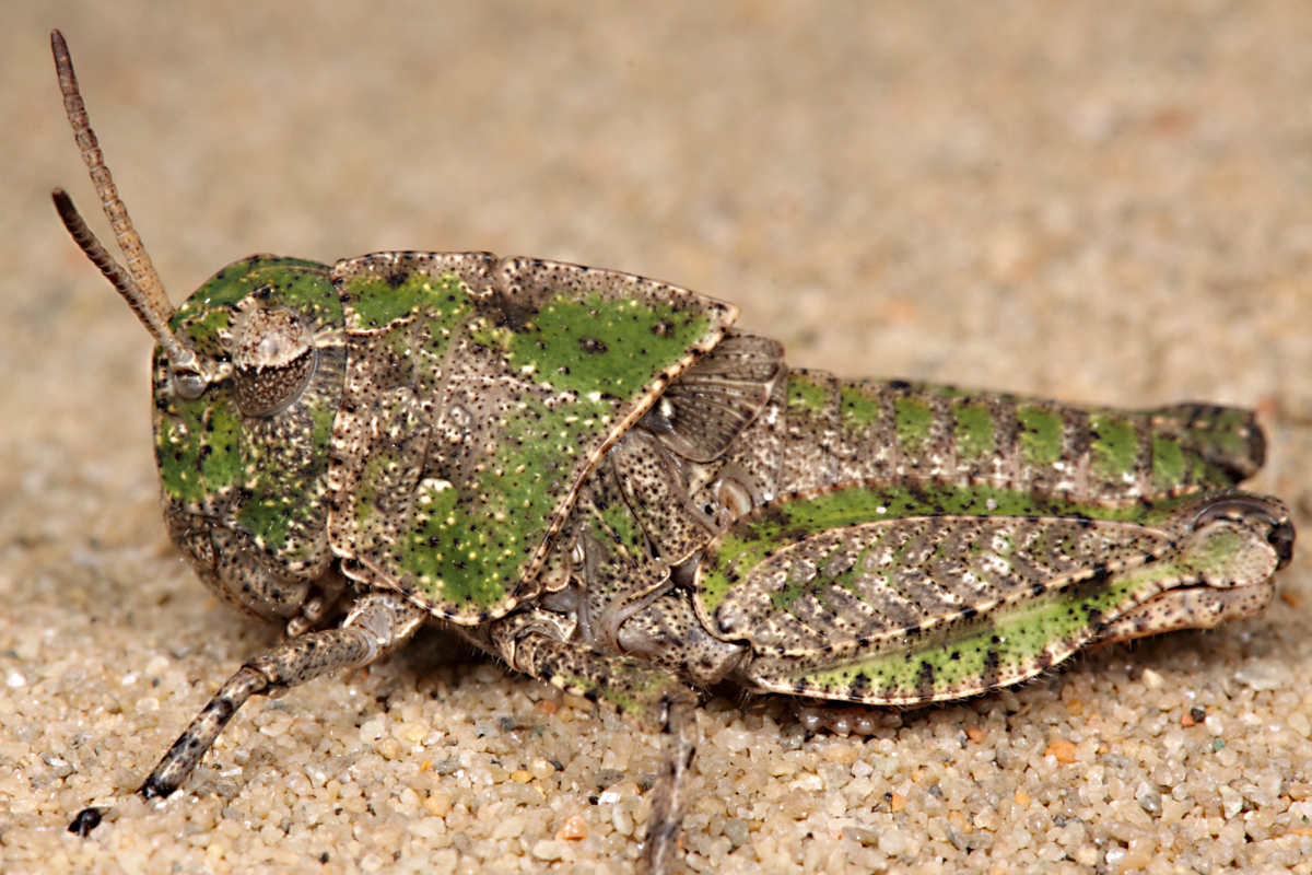 For some reason, I’ve found myself increasingly fascinated with certain grasshoppers—not just any grasshoppers, but band-winged grasshoppers (family Acrididae, subfamily Oedepodinae).  And not just band-winged grasshoppers, but band-winged grasshopper nymphs.  It began last year when I found adults and nymphs of Trimerotropis latifasciata in the Glass Mountains of northwestern Oklahoma.  I believe it has something to do with the combination of their frequent association with the same habitats where I look for my beloved tiger beetles and their marvelously cryptic coloration.  Adults themselves are cryptic enough—that is, until they flash their brightly colored hind wings, but the nymphs are positively invisible until they move.  Moreover, many species show a wonderful range of intraspecific diversity in their crypsis—Ronald Reagan may have thought every redwood tree looked the same, but when you’ve seen one band-winged grasshopper nymph, you most certainly have not seen them all.