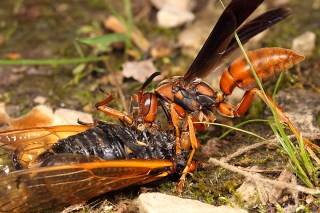 USA: Missouri, Franklin Co., Shaw Nature Reserve, Bluff Overlook Trail, feeding on Magicicada sp. that it stung repeatedly.