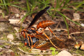 USA: Missouri, Franklin Co., Shaw Nature Reserve, Bluff Overlook Trail, feeding on Magicicada sp. that it stung repeatedly.