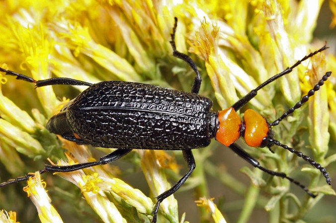 I had other quarry on my mind when I visited Idaho a couple of weeks ago, but I couldn’t help but pay attention to this blister beetle (family Meloidae) feeding on rabbit brush flowers for the following two reasons: 1) its spectacular and boldly contrasting black and orange coloration, and 2) my collecting partner, Jeff Huether, is an expert on North American Meloidae. My identification of this individual as Lytta vulnerata is based strictly on one line of evidence: Jeff said that’s what it is!  My further identification as the subspecies L. vulnerata cooperi is more tenuous, being based on the distinctly sculptured elytra, immaculate pronotum, and more northerly location (nominotypical individuals, at least from what I can tell looking at photos assigned to the two subspecies, have the elytra indistinctly sculptured, generally exhibit a median line or vitta on the pronotum, and occur further south).