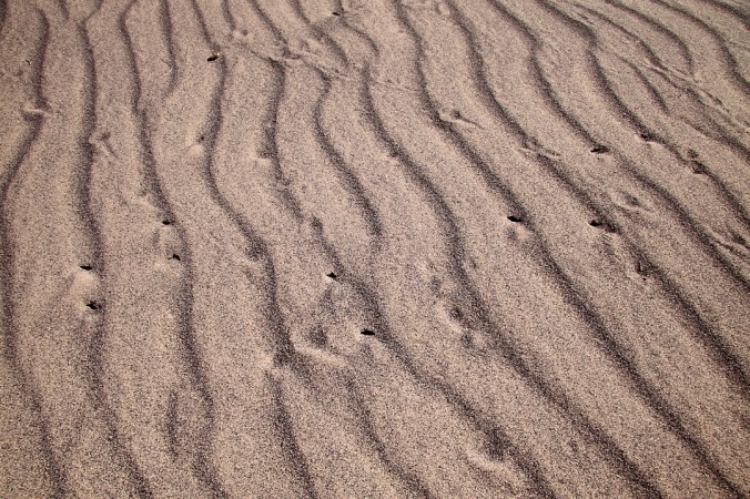 There was obviously no wind in the early morning just before the picture was taken, because it would have wiped out the three trails made by something that was kind of bounding across the sand, making a little crater every time it touched down. From the teardrop shape of the craters, I think they were going from the lower right to the upper left. I’m not sure what they were. Since there were three of them all going the same way, I suspect they were something that you flushed out just before the picture was taken, as you approached from the lower right side. Maybe some sort of crickets? Or tiger beetles half-flying and half-jumping, keeping low to take advantage of the surface effect for efficient flight, while kicking off from the sand periodically for extra speed (and blowing out little craters with the downdraft from their wings every time they touched down)?