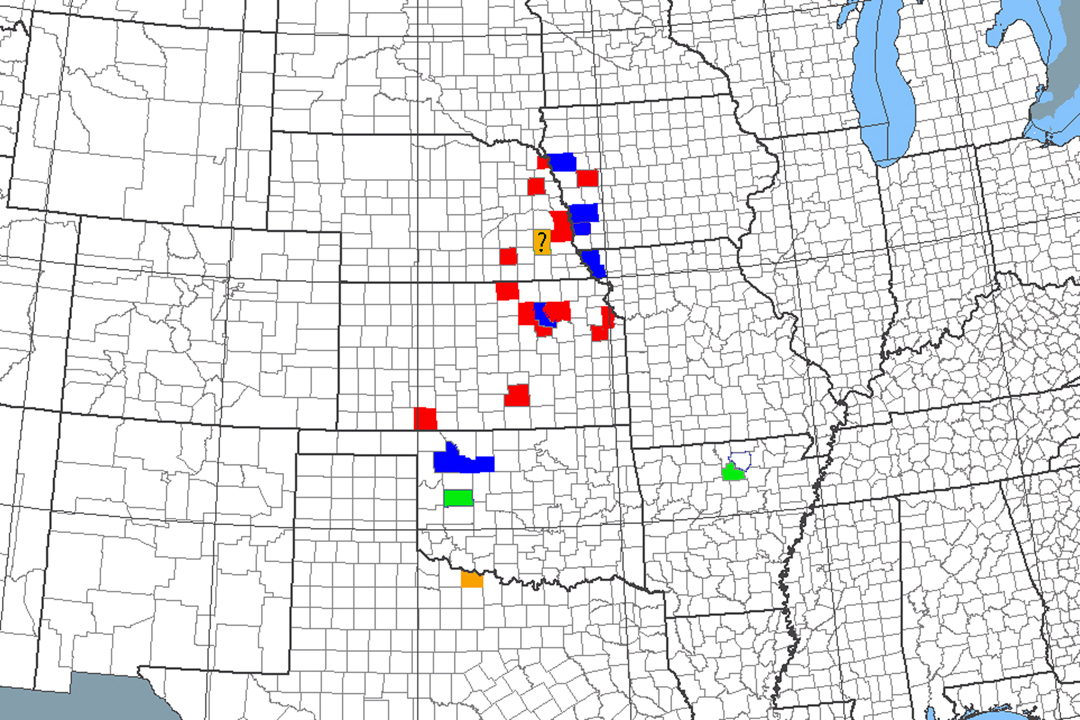 Fig. 8. Historical and currently known geographical occurrence of Cylindera celeripes by county. Red = last record prior to 1920; orange = last record 1941–1960 (“?” = questionable record); green = last record 1991–1996; blue = last record 2005–2011.