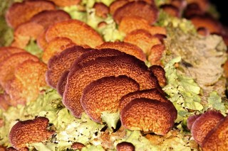 Turkey tails (Trametes versicolor) on lichen-encrusted trunk of fallen post oak (Quercus stellata).