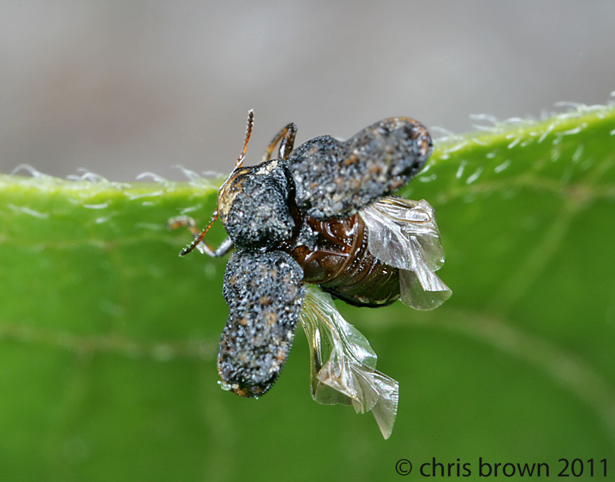 I’ll be the first to admit that these photos aren’t nearly as striking as Gianfranco Merati‘s photos of Polybothris sumptuosa, but they do well illustrate the iridescence that is common to these beetles. Iridescent coloration is due not to pigments in the exoskeleton, but rather the physical properties of different layers in the insect cuticle that reflect light of specific wavelengths in different directions (hence, resulting in apparent color shifts depending on the angle at which the subject is viewed).