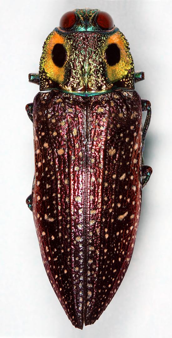 I have a fair number of chalcophorines in my collection, and among the more recent acquisitions is this fine specimen of the species Madecassia rothschildi. One of a pair of specimens given to me by friend and world buprestid-expert Chuck Bellamy, this larger of the two measures a whopping 45 mm in length (that’s almost 2 inches, folks!), surely near the top end of the range for this genus and paling only against such giants as Euchroma and Megaloxantha. The reddish-brown eyes on a brilliant green head, turquoise legs and white-flecked, wine-colored elytra are enough to make it stand out, but it is the distinctive yellow-lime “false eyes” that made me do a double-take when I first laid eyes on them after opening the box. A closer look at the eye spots reveals the yellow-lime area to be densely pulverescent.