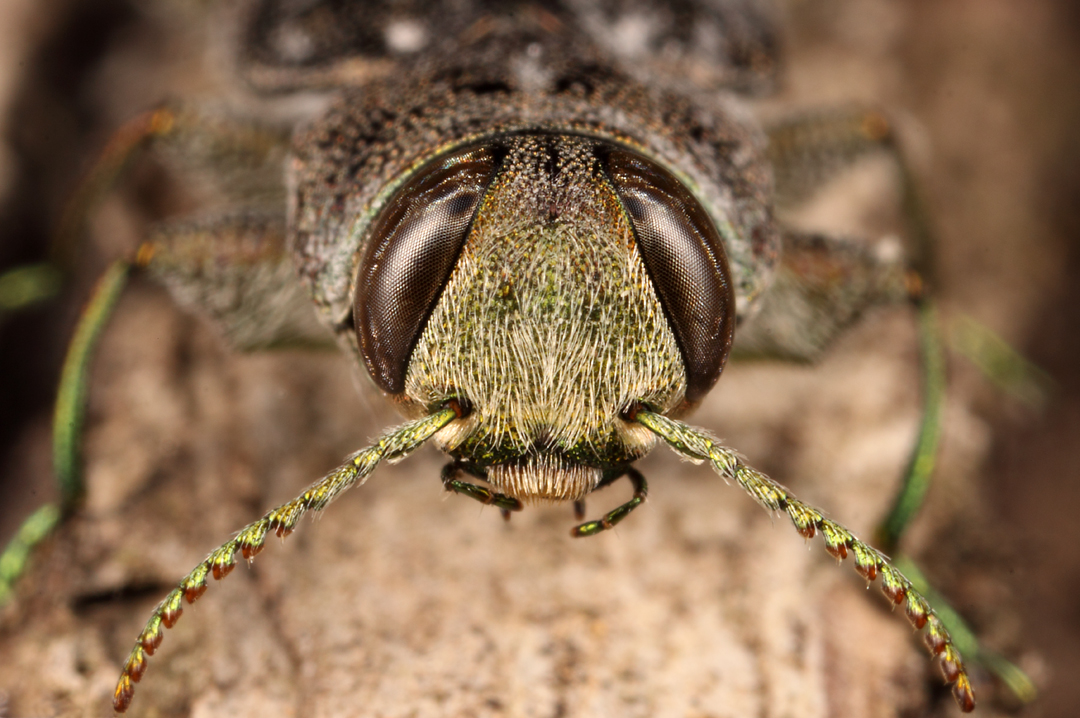 Males sport not only the green face for which the species is named, but also distinct yellow areas on the antennal segments