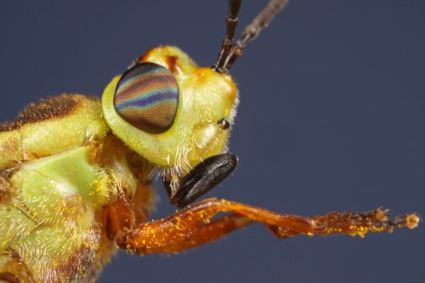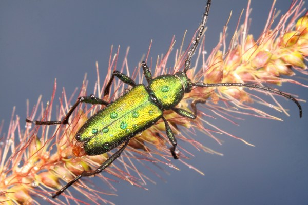 I photographed several of these beetles on S. chilensis flowers at two locations in Chaco Province along Ruta 16 west of Resistencia, but I was generally unsatisfied with how the photos turned out. The combination of the beetles’ metallic sheen and the bright yellow color of the flowers made getting the right exposure and lighting difficult—I either blew out the yellow on the flowers or ended up with deep shadows on the beetles. One morning I encountered this female sitting on the seed head of an grass unidentified grass. Torpid from the cool temperatures and covered in morning dew, she was a most cooperative subject, and the colors of the seed head turned out to be much more complimentary for photographing the beetle that the bright yellow goldenrod flowers.