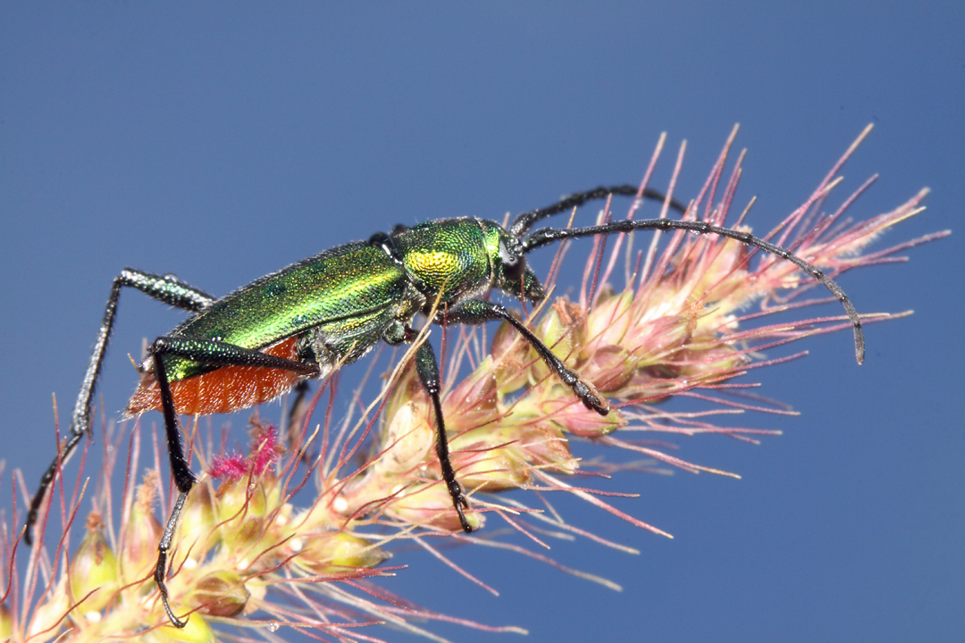 I’ve mentioned a few times that April is not a very good time to look for beetles in northern Argentina, as the months preceding April are typically hot and dry. September through January would be a much better time, especially to look for the wood boring beetles (families Buprestidae and Cerambycidae) that I am so fond of. Still, if I am in Argentina in April then I must look for beetles in April, and while I didn’t see a single buprestid during my week in Corrientes and Chaco Provinces last month I did a fair number of cerambycid beetles on stands of goldenrod (Solidago chilensis) at a few localities in Chaco Province. One particularly common species was Aglaoschema rufiventre, a beautiful metallic green species with, you guessed it, a red abdomen. Aglaoschema is a rather large (27 species), exclusively Neotropical genus whose members superficially resemble the diurnal, brightly colored species of the tribe Trachyderini but actually belong to the tribe Compsocerini. Most of the species occur in Brazil, but six extend further south into Argentina. Of these, A. rufiventre most resembles A. haemorrhoidale and A. ventrale but is distinguished by its subcylindrical antennal scape—or first segment (clavate in A. ventrale) and non-roughened elytra (roughened—or “asperate”—in A. hemorrhoidale) (Napp 2007). No hosts have been reported for A. rufiventre (Monné 2001), so my finding of adults on flowers of S. chilensis seems to be the first reported host association for the species.