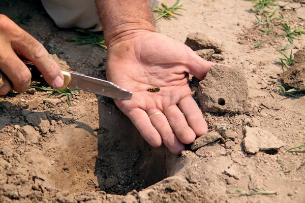 Years of practice digging up tiger beetle burrows prepared me well for my first attempts at digging up C. fumipennis burrows. While it might seem an easy task to follow a hole into the ground while digging soil away from it, in practice the burrow can be quickly lost after even a few inches due to falling soil covering the hole and making it impossible to relocate. I use a thin, flexible but sturdy grass stem to preserve the burrow path, inserting the stem into the burrow and down as far as it will go and then removing the soil carefully from around the hole with a knife or trowel. I try to avoid letting soil fall over the hole by prying the soil away from the hole, but if the hole does get covered the grass stem allows it to be easily relocated.