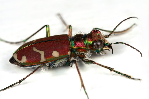 There is, however, a lesson here to be learned, and that is don’t be too quick to send to the recycle bin a photo that at first sight appears not worth keeping. Take, for example, this photograph of Cicindela limbalis (Common Claybank Tiger Beetle). This pretty little species is broadly distributed in Canada and the northern U.S. from New England across the Great Plains to the eastern edge of the Rocky Mountains. Different populations show differing degrees of maculation, and here in Missouri the species is nearly immaculate. I found the individual in the above photo in Wyoming’s Medicine Bow National Forest as an example of the more completely maculated forms. However, since it was the only individual I saw in that location I didn’t try to photograph it in the field. Instead, I captured it and photographed it later in the “studio” (my hotel room). Sadly, this was in September 2010 when I was still a rank beginner in terms of insect macrophotography, and as a result I was far less versed on such details as lighting and composition than I am now. I’m ashamed to say that I thought this photo was “good enough.”