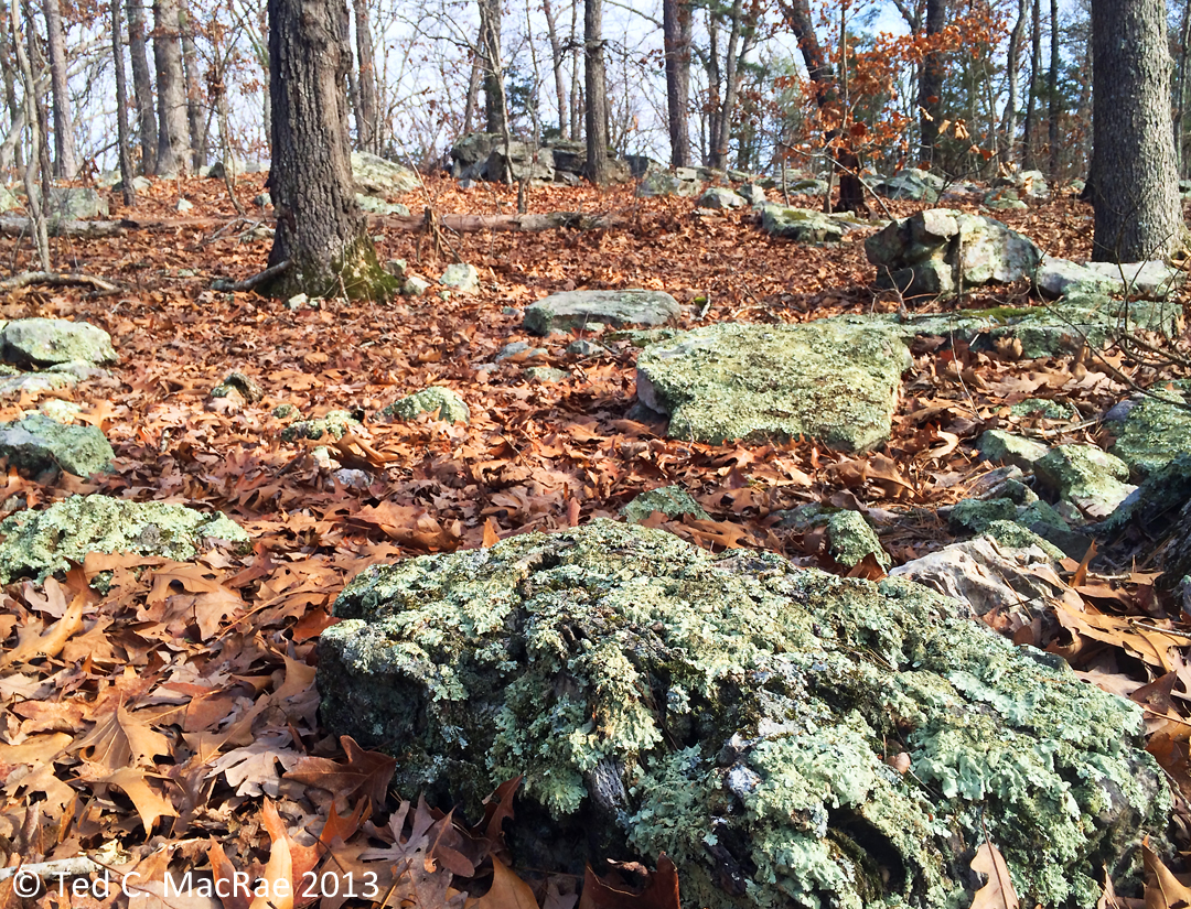 Crustose lichens abound on the dolomite bedrock exposures along the “Narrows” – a long, narrow ridge between the Courtois and Huzzah Creek Valleys.