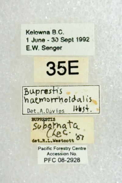 Examination of the specimen labels leaves little doubt that this specimen is the basis of the Humble & Allen (2006) report of B. haemorrhoidalis in Canada—the specimen resides in the PFCARC (the institute with which L. Humble and E. Allen were affiliated), and the reported date of introduction (1992) matches the specimen date of collection. There also can be little doubt that this specimen is the basis of the Bousquet et al. (2013) report of B. haemorrhoidalis in British Columbia—the label indicates collection in “Kelowna B.C.”, and the initial identifier (A. Davies) is the author of the Buprestidae chapter in the first edition of the Canada checklist (Davies 1991) and a coauthor of the second edition.