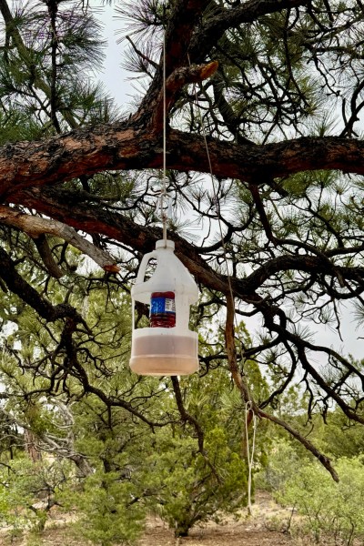 “Jug trap” hanging in ponderosa pine with two improvements: larger (500-ml) bait bottle, and larger volume of diluted propylene glycol (1250 ml instead of 900 ml).