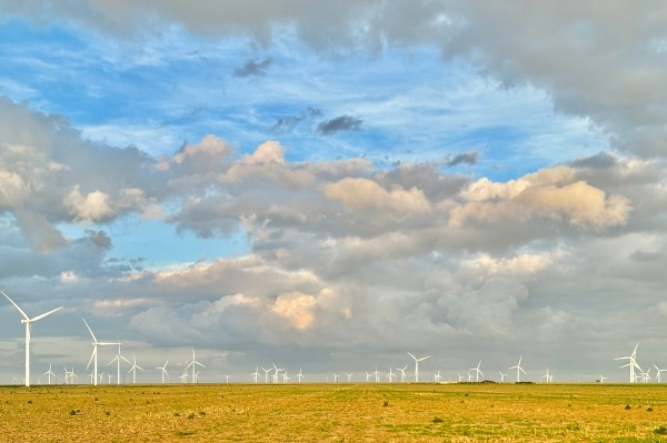 Sunlit windmills stretch across the horizon under changeable skies.