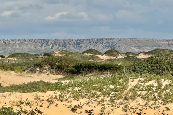 Distant sand dunes frame an even more distant escarpment.