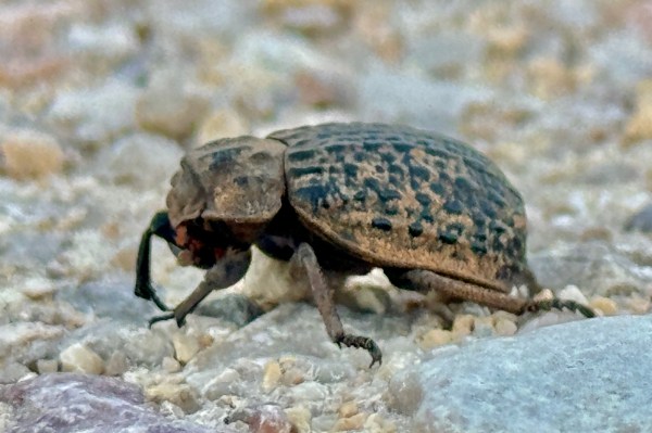 The fresh rain, coolish temps, and near-full moon made setting up the lights to attract insects out of the question, but after dinner when darkness had fully settled we walked the road through the campground to look for nocturnal beetles. I was hoping to find Amblycheila picolominii (Plateau giant tiger beetle), one of which had had found up on the rock slope the last time I was here, but I wasn’t thrilled with the idea of clambering over steep, wet rocks in the dark and settled for the pavement up to the beginning of the tent campground and back. Large tenebrionid darkling beetles were expected, thus the two we saw were no surprise, but what did surprise and delight us was another male tarantula—and not the common Texas brown tarantula (Aphonopelma hentzi) but the much less commonly encountered Chihuahuan gray (A. gabeli)! This was a delight and becomes the fourth species of tarantula I’ve found in the wild. We trailed it back and forth as it ambled along the road trying to get good photos, but it never stopped long enough to allow such. Eventually it did stop along the side of the road, where we took some “okay” photos before moving on.