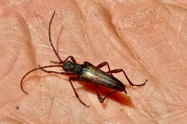 For a long time nothing hit my beating sheet (except a shower of water drops, which I had to continually shake off the sheet). Just before we passed back out of the Gambel oak zone after beginning our descent, I got a sort of consolation prize—a large(-ish) sp., and as I was putting the beetle in the vial a Prionus heroicus male flew by and circled slowly back towards me to within net’s reach. Not long after, as I was beating the last of the Gambel oaks that we would see, Rich called out to me from further down on the trail saying he saw another Prionus crawling on the ground and that it had crawled under a dead log. We lifted the log (gray oak), and there she sat—the most enormous gravid female P. heroicus I’d ever seen! I wanted a photo, but she started running so I blocked her with my finger to get her to stay still. This did not work despite repeated attempts, and at one point when I became rather careless with my finger placement she gave me the most painful beetle bite I’ve ever had—bringing blood right on the most sensitive part of my fingertip! I guess giving me a good nip brought her some satisfaction, because after that she stayed put long enough for me to snap the photos I wanted. By this point, we were really feeling the combination of miles, heat, thirst, and hunger and focused on completing the rest of the descent back to the parking area, where we enjoyed a (very) late lunch and cold liquids under a table with shade!