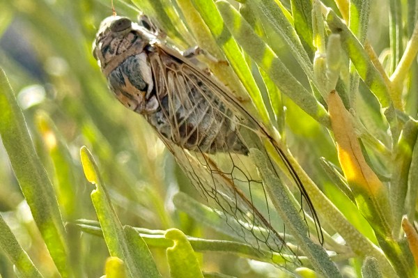 Hadoa townsendii (family Cicadidae) on old fruit stem of Yucca elata (soaptree yucca) at edge of white sand dune.